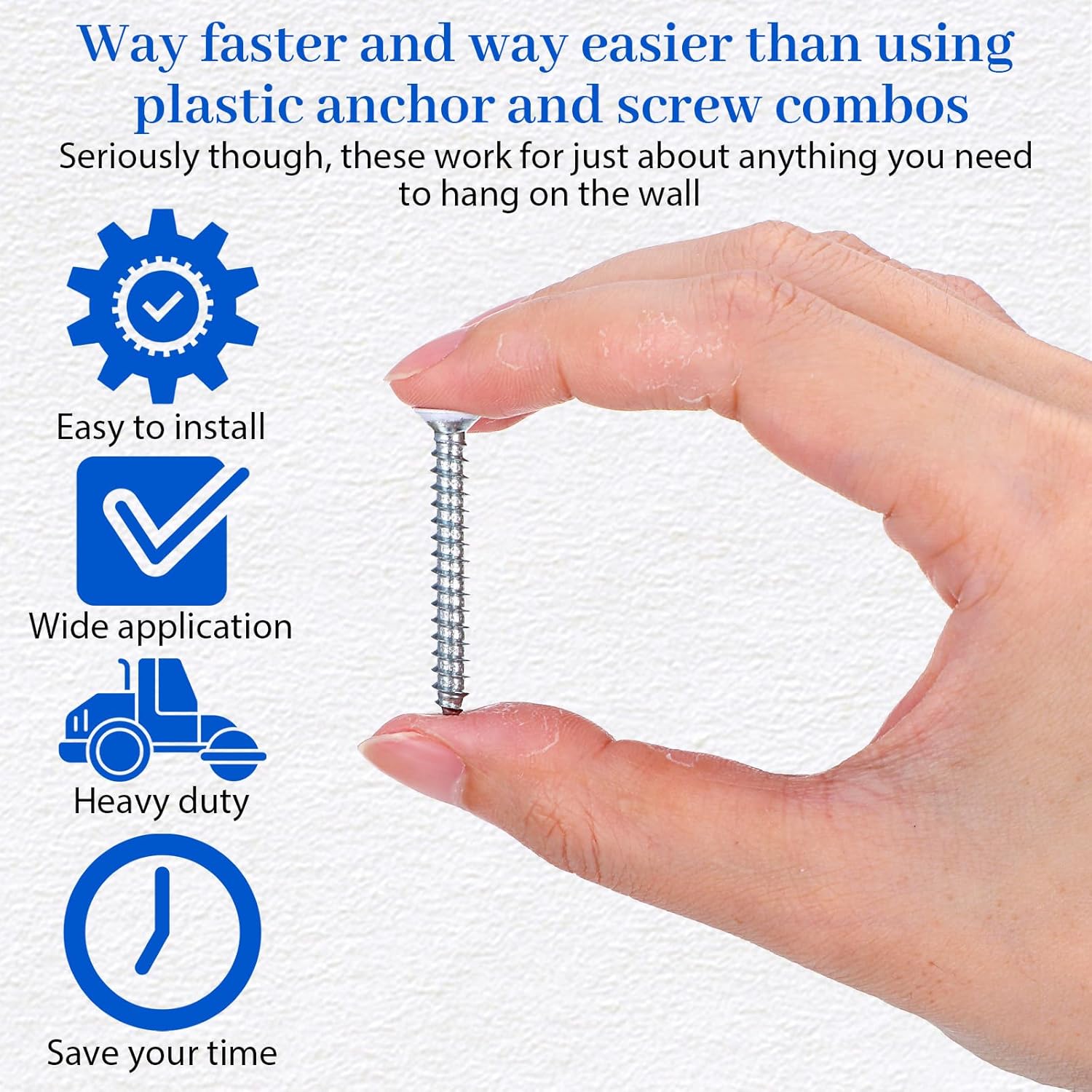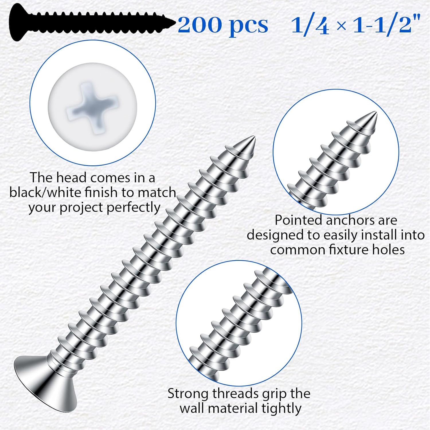 Superior Holding Power: The advanced thread design ensures deep penetration and creates a reliable mechanical expansion within hollow wall materials. This provides a strong, lasting hold that can support a variety of items, giving you peace of mind that your installations are secure.All-Inclusive for Immediate Use: We include a dedicated 65mm Phillips #2 screwdriver bit, perfectly matched to the anchor heads. This eliminates the hassle of searching for the right tool and ensures optimal torque transfer for smooth, cam-out-free installation right from the start.Product Specifications: Material: High-Strength Carbon Steel Finish/Color: Corrosion-Resistant White Coating Screw Head Type: Flat Head (Countersunk) Drive Type: Phillips #2 Anchor Dimensions: 1.55 inches (Length) x 0.35 inches (Diameter) Included Screwdriver Bit: Phillips #2, 65mm shaft length (approximately 2.56 inches)Package Contents: 200 x White Countersunk Self-Drilling Drywall Anchors 1 x Phillips #2 Screwdriver Bit (65mm / 2.56in)Installation Guide: For optimal results in standard drywall, plasterboard, or wood, you can typically drive the anchor directly using the provided bit. When installing into very dense materials like solid concrete, brick, or masonry, we recommend pre-drilling a pilot hole slightly smaller than the anchor's diameter to guide it and prevent material stress. Drive the anchor until the head sits flush with the wall surface for the best load distribution and a clean finish.Note: Slight variations in measurements may occur due to manual sizing. Actual load capacity depends on proper installation technique and the specific condition/type of wall material. Screen colors may vary slightly.