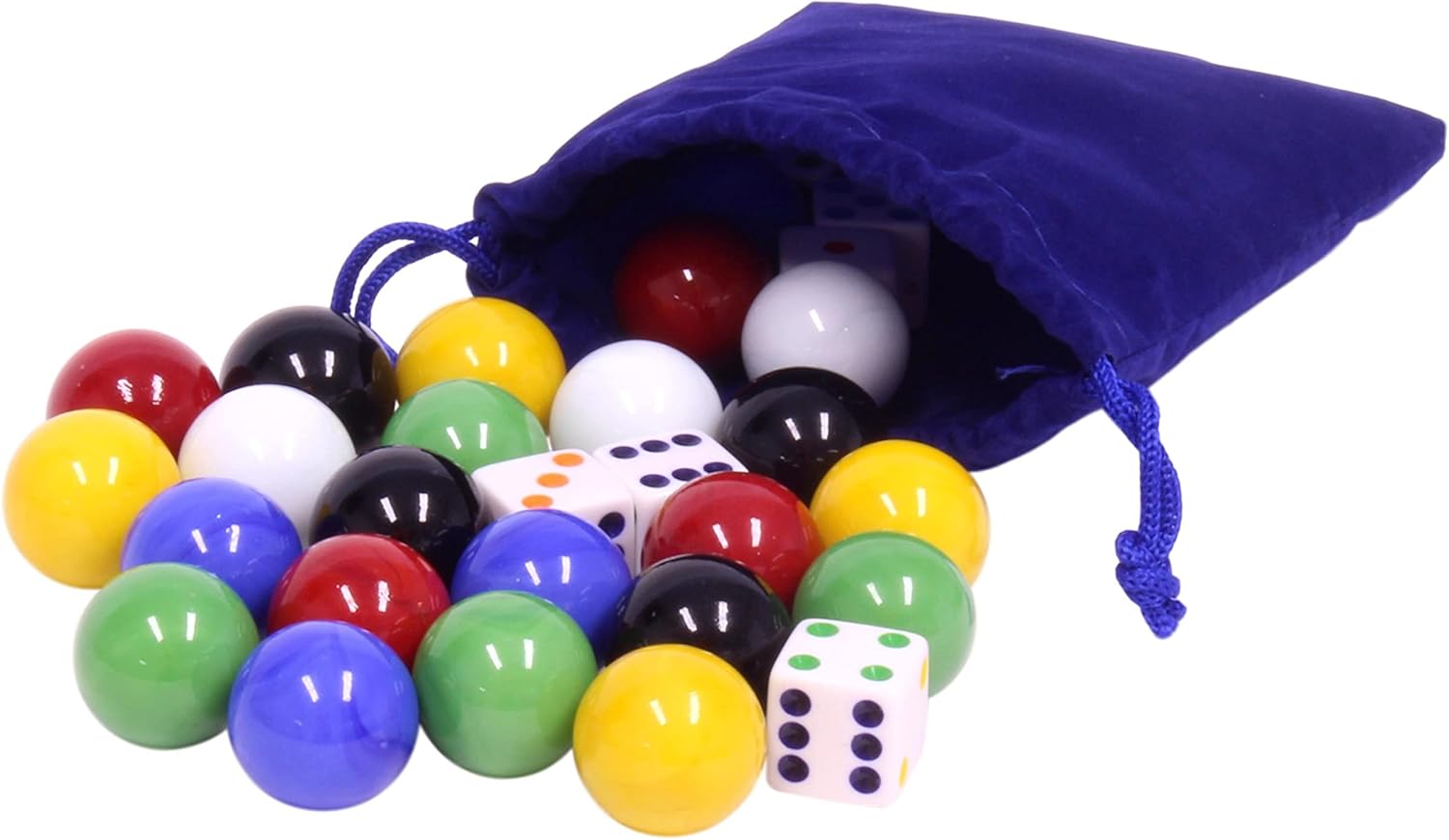 Here is a set of replacement game marbles and dice for your Aggravation/Wahoo Game Board. The marble and dice set from AmishToyBox.com includes 4 glass marbles of 6 colors (red, blue, black, green, yellow, and white). The x-large glass marbles are 22mm (approximately 7/8") in diameter and the 6 dice are 16mm square. The set of 24 marbles and 6 dice come in a handy drawstring cloth pouch. These 22mm sized marbles are what we include in our AmishToyBox.com 24" wide Aggravation Wahoo games.