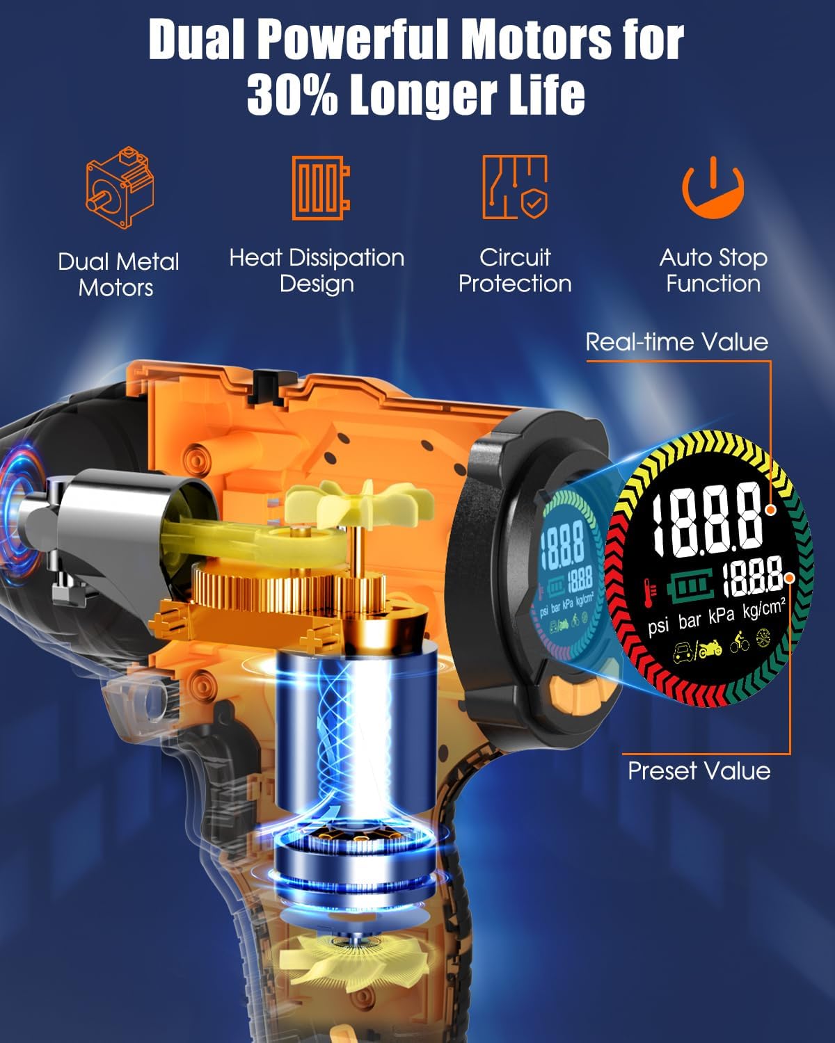 | Included Components | 110v-240v Wall Plug in Adapter, 12V DC Cigarette Lighter Power Cable, Air Compressor with One Battery, High-pressure Hose with Quick Connector, Inflator Accessories & Fabric Carry Bag |