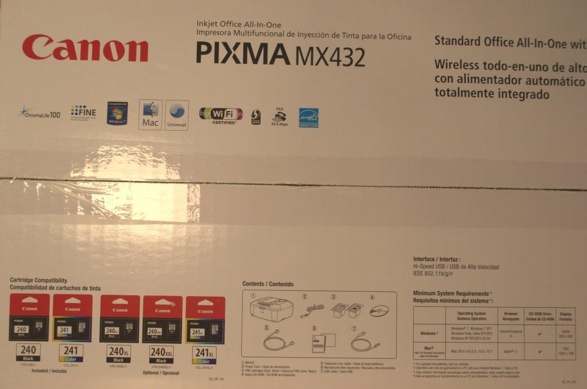 Product Description Wireless Printing with Features That Let You Get Down to Business From the Manufacturer Bring excellent quality, speed, and ease of use to your home office all in the name of increased productivity. This begins with built-in Wi-Fi®1 for printing and scanning virtually anywhere in your home from computers and compatible mobile devices. This also includes AirPrint2, which lets you wirelessly print photos, emails, web pages, documents and more from compatible iPad, Phone or iPod touch devices to a compatible Canon PIXMA Wireless All-In-One. An integrated 30-sheet Auto Document Feeder, FastFront, and Easy-WebPrint EX3 are just some of the features that can allow you to easily multi-task while your PIXMA MX432 is at work for all-new levels of efficiency.4800 x 1200 maximum color resolution4 and the FINE Cartridge System means superb business document printing and efficiency while built-in imaging technology ensures the integrity of originals are preserved with each copy and scan. Maintain security standards by utilizing features to prevent misdialed fax transmissions and keep scanned files password protected.The MX432 also allows you to turn your office into a photo lab and print beautiful, borderless5 photo lab quality photos up to 8.5" x 11" in size. Your photo printing options now also include Full HD video6 while you can enjoy computer-less printing through compatible direct print options.The MX432 delivers the business imaging quality and versatile solutions that can assist you in bringing your business to the next level. So, you can print business documents when you need to and photos when you want to.OVERVIEW For the 9th year in a row, Canon U.S.A. is proud to have received the 2012 Readers' Choice Award for Service & Reliability from PCMag.com for Printers.* *A trademark of Ziff Davis, Inc. Used under license. Reprinted with permission. Copyright. 2012 Ziff Davis, Inc. All rights reserved. Click here for a larger imagePIXMA MX432 Wireless Office All-In-One PrinterWireless1 Printing with Features That Let You Get Down to BusinessFully-Integrated 30-sheet auto document feeder for rapid document copying, scanning and faxingFastFront System makes changing ink and paper easy and convenient right from the front of the printer.Print and scan wirelessly right from your compatible iPhone, iPad or Android Device, no computer needed7Collect, combine and edit multiple web pages to print your own layout using Easy-WebPrint EX3 FEATURES & BENEFITS SPEED & QUALITY Fantastic Resolution: 4800 x 1200 maximum color dpi4 produces incredible quality and detail in both your business documents and photos. High Performance Ink Cartridges: These two genuine Canon ink cartridges contain specially formulated inks for great document and photo quality. One is a Pigment Black cartridge for crisp, professional text and one is a multi-color cartridge for pictures. Both are easy to use and replace. Beautiful, Borderless Photos Fast: Print a borderless, 4" x 6" photo in approximately 46 seconds.8 ChromaLife100: This system combines enhanced FINE print head technology with select genuine Canon photo papers and inks for beautiful borderless photos that will last up to 100 years when stored in an archival-quality photo album.9 EASE OF USE Fully-Integrated, 30-sheet Auto Document Feeder: Easily copy, scan and fax multiple documents without having to load them one page at a time. Enjoy full integration so the printer can better fit in tight workspaces. FastFront: This innovative design feature allows for even easier replacement of your Genuine Canon Ink and papers right from the front of the machine. Full HD Movie Print: Full HD Movie Print software turns your favorite HD movie clips captured with compatible Canon EOS Digital SLR or PowerShot cameras into beautiful prints.6 2-Line LCD: Easily set print and copy quantities while also viewing the printer's status. Auto Scan Mode: With one press of the Scan button your original is automatically recognized and saved in the correct format.10Auto Document Fix: This built-in software automatically analyzes and corrects both text and image documents so text will remain clear and easy to read with pronounced edges, and pictures will keep their true color with highlights, shadows, and dots being smoothed out. CONNECTIVITY Built-In Wireless: Print and scan wirelessly1 from any Wi-Fi® enabled computer around the house. Super G3 Fax: The high speed business fax11 standard for color and PC facsimiles on plain paper meets the home office workhorse with 20 coded speed dials and up to 50 incoming pages.12 AirPrint: Wirelessly print photos, emails, web pages, documents and more from compatible iPad, Phone or iPod touch devices to a compatible Canon PIXMA Wireless All-In-One. There’s no software to download, no drivers to install, and no cables to connect. Just see it, tap it, and print it!2 Mobile Printing: The free EasyPhoto-Print app lets you wirelessly print and scan jpg and pdf files from compatible iPad, iPhone, iPod touch, and Android devices.6PictBridge & Optional Bluetooth: Print directly from digital camera, DV camcorder, or camera phones via PictBridge13, or the optional BU-30 wireless Bluetooth14 unit. ADDITIONAL FEATURES & BENEFITS COMPATIBILITYWHAT'S IN THE BOX Windows® 7, Windows Vista®, Windows XP15Mac OS® X v10.5.8, 10.6, 10.715 PIXMA MX432 Wireless Office All-In-One PrinterDocument Kit: Cross Sell Sheet, Getting Started, Important Information Sheet, Network Setup Troubleshooting, Setup Software & User's Guide CD-ROM, Warranty CardInk Tanks: PG-240 (Black Cartridge), CL-241 (Color Cartridge)Power CordSample Media - PP-201, 3 SheetsTelephone Line Cable COMPARE PIXMA MX432Wireless Office All-In-One PIXMA MX512Wireless Office All-In-One PIXMA MX892Wireless Office All-In-OneCurrently Viewing Functions Print, Copy, Scan, Fax, Photo Print, Copy, Scan, Fax, Photo Print, Copy, Scan, Fax, Photo Speed & Quality ISO Print Speed (up to)18 / 4" x 6" Borderless 