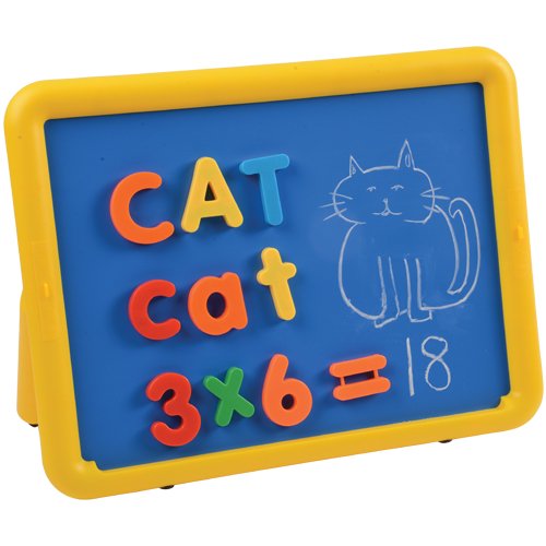 This magnetic board features a write-on/wipe-off, magnetic board on one side and a magnetic chalkboard on the reverse side. Includes 40 PC. Set of giant upper and 40 PC. Set of Lowercase magnetic, plastic letters and 27 PC. Numbers and math symbols.