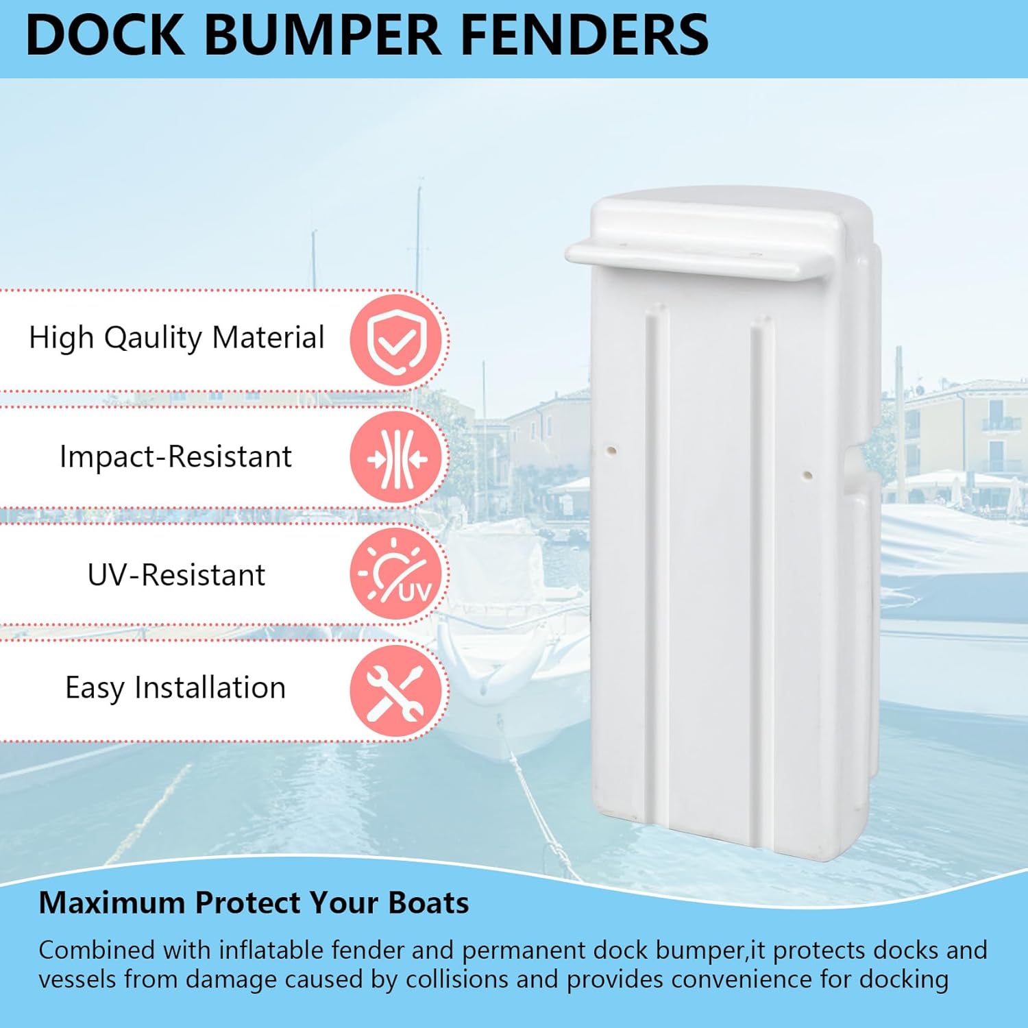 Product Description Product Name:Dock Bumpers,Dock Bumper Guards Product Size:15.3inx5.2inx3.8in Product Color:White/Black/Grey Product Material:High Quality Vinyl Side Mounting Holes:6 Inches From Top Features: UV-resistant, impact-resistant and anti-tear