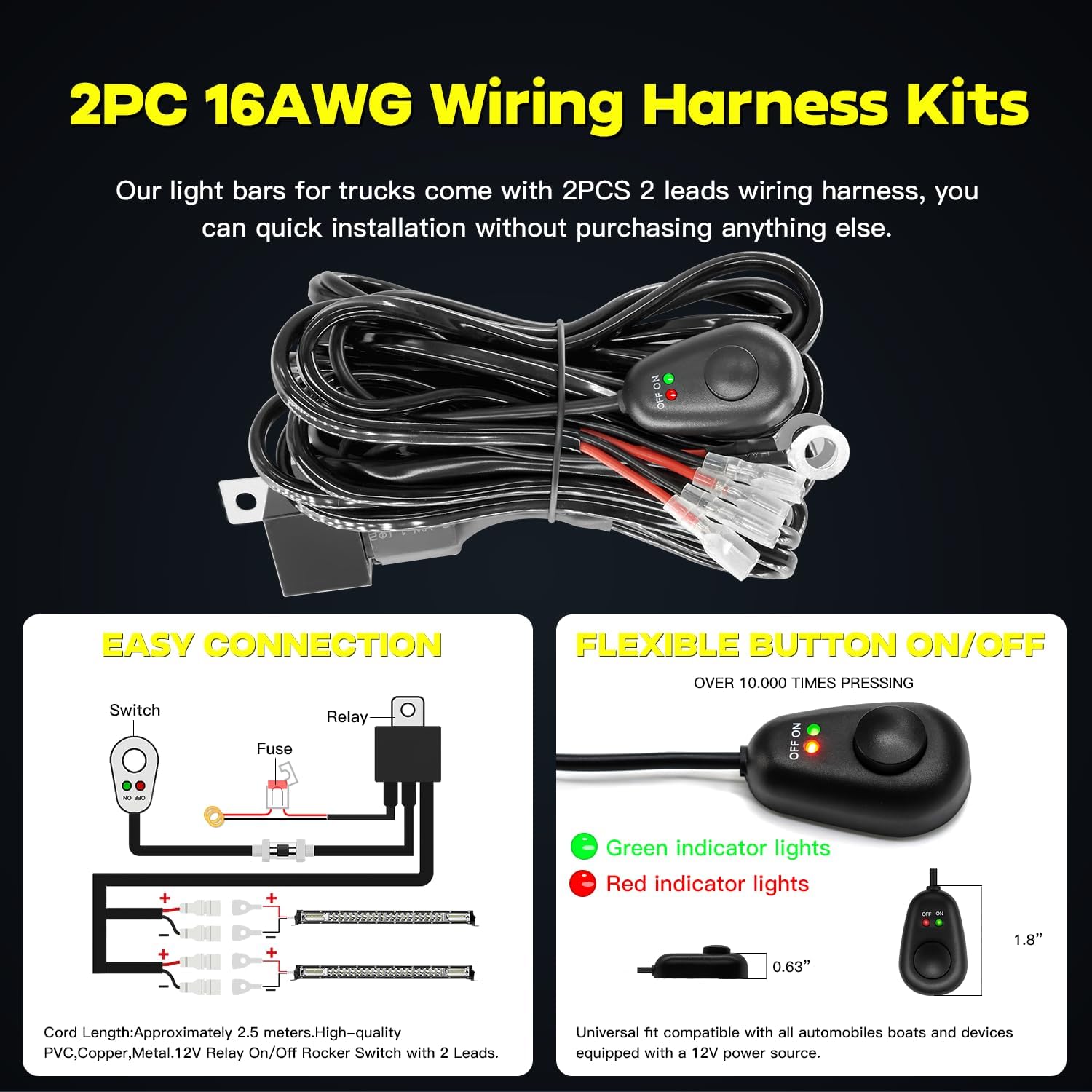 | Included Components | 2 X Set Wiring Harness Kits with Rocker Switch, 2X 20Inch 180w LED light bar, 4 X 4Inch 72w pods cube driving lights |