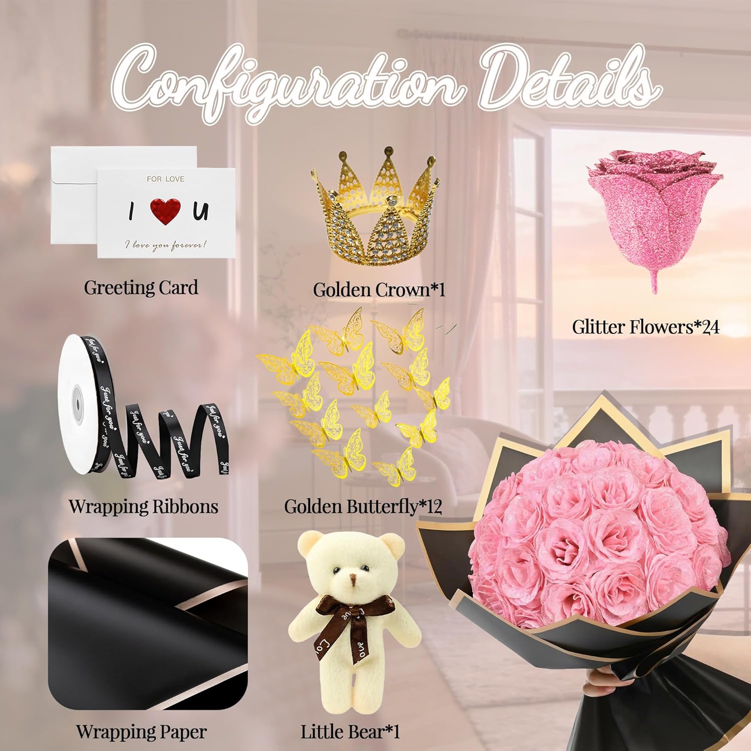 | Included Components | 12-101 glitter roses and 12-101 stems;, 4*wrapping paper;12*butterflies;1*crown;1*bear;1 greeting card;1*Gift Box |