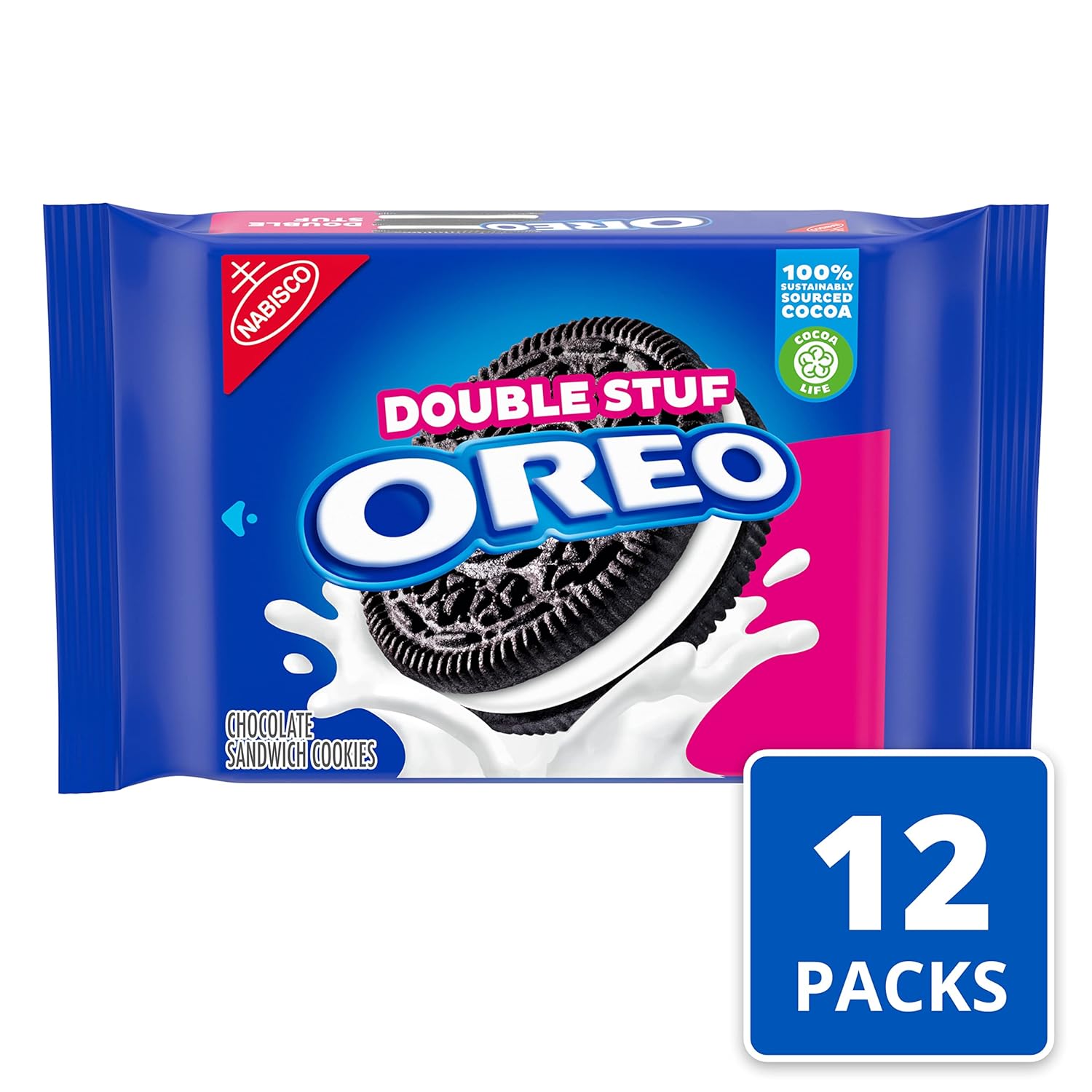 OREO Double Stuf Chocolate Sandwich Cookies have been America's favorite cookie for over 100 years. Stuffed with twice as much original OREO creme, these chocolate sandwich cookies are supremely dunkable. Double Stuf OREO cookies are great for sharing with friends or enjoying with a cold glass of milk. OREO Double Stuf cookies are also a hit as party snacks at your next gathering. During the day, pack them as sweet snacks for school lunch or work. The resealable packs with easy-pull tab keeps chocolate cookies fresh and is great for snacking, sharing, or traveling. With 12 packs of OREO Double Stuf, you'll stay ready for any snacking occasion. Cocoa Life: 100% Sustainably Sourced Cocoa; OREO partners with Cocoa Life to help support sustainable cocoa sourcing. Cocoa life works together with farmers to grow cocoa in ways that help protect people and the planet. For more information visit the Cocoa Life website.