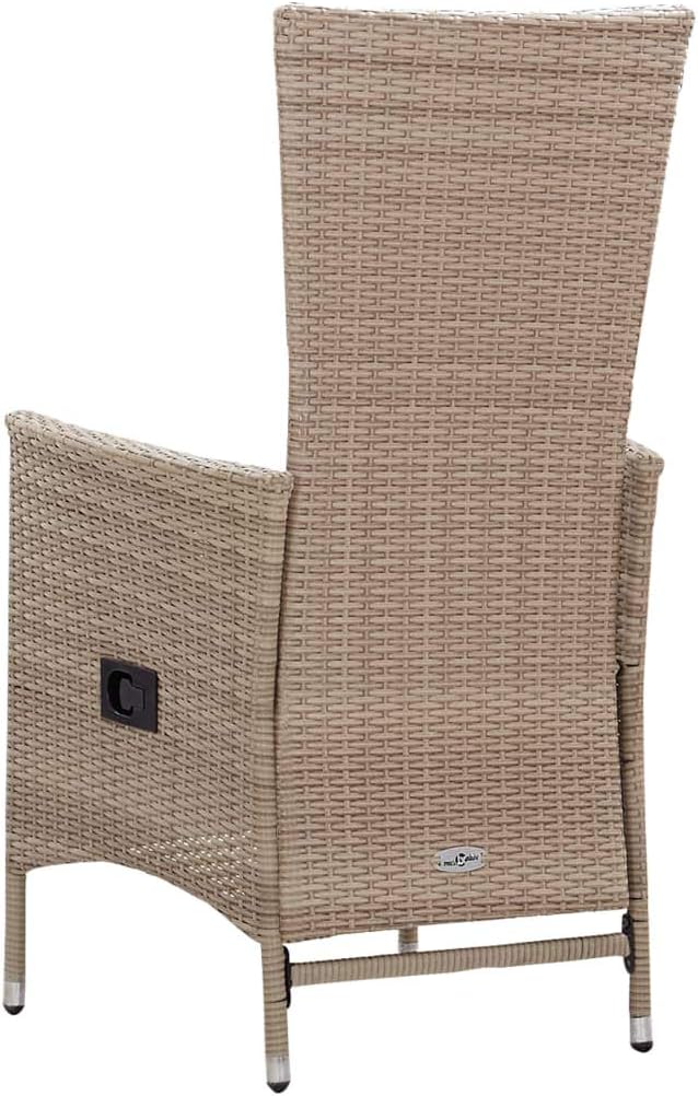 Our stylish poly rattan armchair will become the focal point of your garden or patio!Made of the water-resistant PE rattan, the armchair is easy to clean, hard-wearing and suitable for daily use. The powder-coated steel frames make the chairs strong and sturdy. The reclining chairs give you all the comfort needed. The backrest will recline by pulling the button on the side. Thanks to their lightweight construction, they are easy to move. It is also delivered with highly comfortable, thickly-padded seat cushions for the ultimate comfort. The low-maintenance polyester covers can also be removed and washed. Assembly is easy.Note: We recommend covering the set in the rain, snow and frost.Poly rattan Color: BeigeCushion Color: Cream whiteMaterial: PE rattan, powder-coated steelCushion cover material: 100 % polyesterDimensions (not reclined): 22.8" x 24.4" x 42.5" (W x D x H)Dimensions (reclined): 22.8" x 35.4" x 35.8" (W x D x H)Cushion thickness: 2" Seat width: 18.5" Seat depth: 18.5" Seat height from the ground without cushion: 16.9" Armrest height from the ground: 26.4" Adjustable backrestAssembly required: YesDelivery contains:2 x Chair2 x Seat cushion