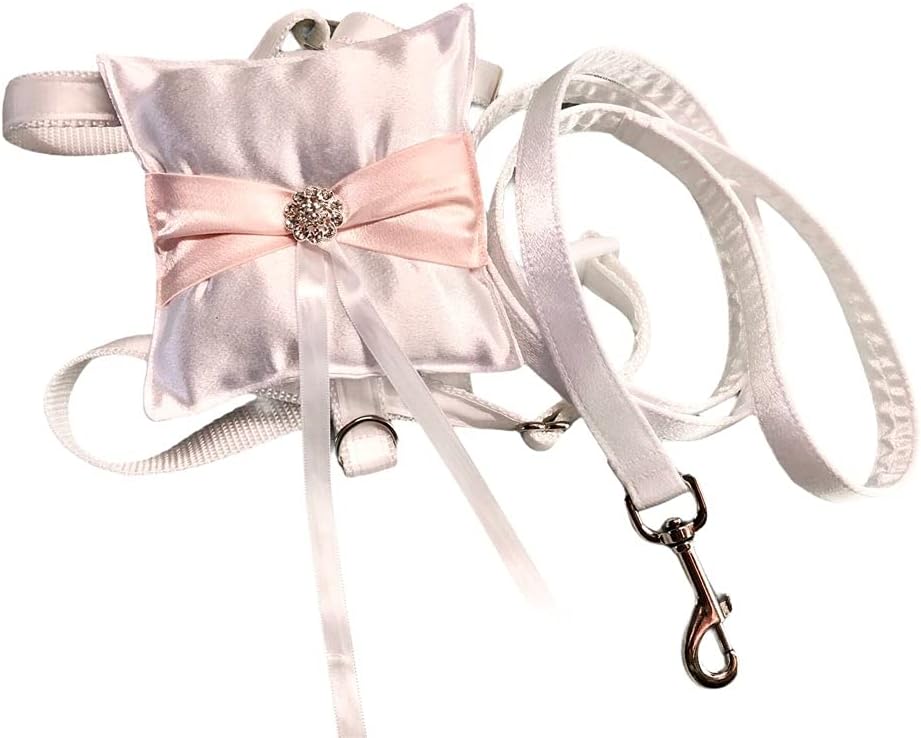 This gorgeous satin Ring Bearer Dog Collar with Harness and Matching Leash is the perfect way to include your four legged best friend in your wedding. Harness is adorned with satin ribbon, nickel hardware and a matching white buckle. Ring bearer pillow easily and securely slides onto the harness and features a crystal center button. Three colors are available to best match your wedding party. Leash is 4ft long. Harness is adjustable for a snug fit.