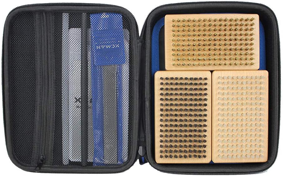 Ski Snowboard Waxing Brush Scraping Wax Plate Trimming Patching Tool KitDescription: 1.This is a snowboard waxing kit (STK-1), a practical and cost-effective tool kit for personal and ski traders to repair and polish waxing skis. 2.Snow friends can classify all kinds of tools that need to be sorted into the toolkit, which is convenient to carry and keep, especially when going out for skiing. You can take out the necessary tools for maintenance and maintenance whenever and wherever you need them.The kit has enough space to put in other tools, such as wax, or tools such as angle gauges. Package Includes: 1.Nylon brush 2.Horse hair brush 3.Copper wire brush 4.6" long oblique tooth single flat file 5.Double-plate scraping board (scraping excess snow wax) 6.PTEX bottom plate repair strip (one for each black and white) 7.Metal scraping wax board (for scraping excess PTEX material) 8.Toolkit Feature: 1.The three sets of brushes are all made of European imported eucalyptus wood, the wood grain is very beautiful, and the high-end, feel good. 2.The 6-inch long file is suitable for repairing the bottom of the board and the edge of the blade. The steel blade can also be used together with the angle ruler.
