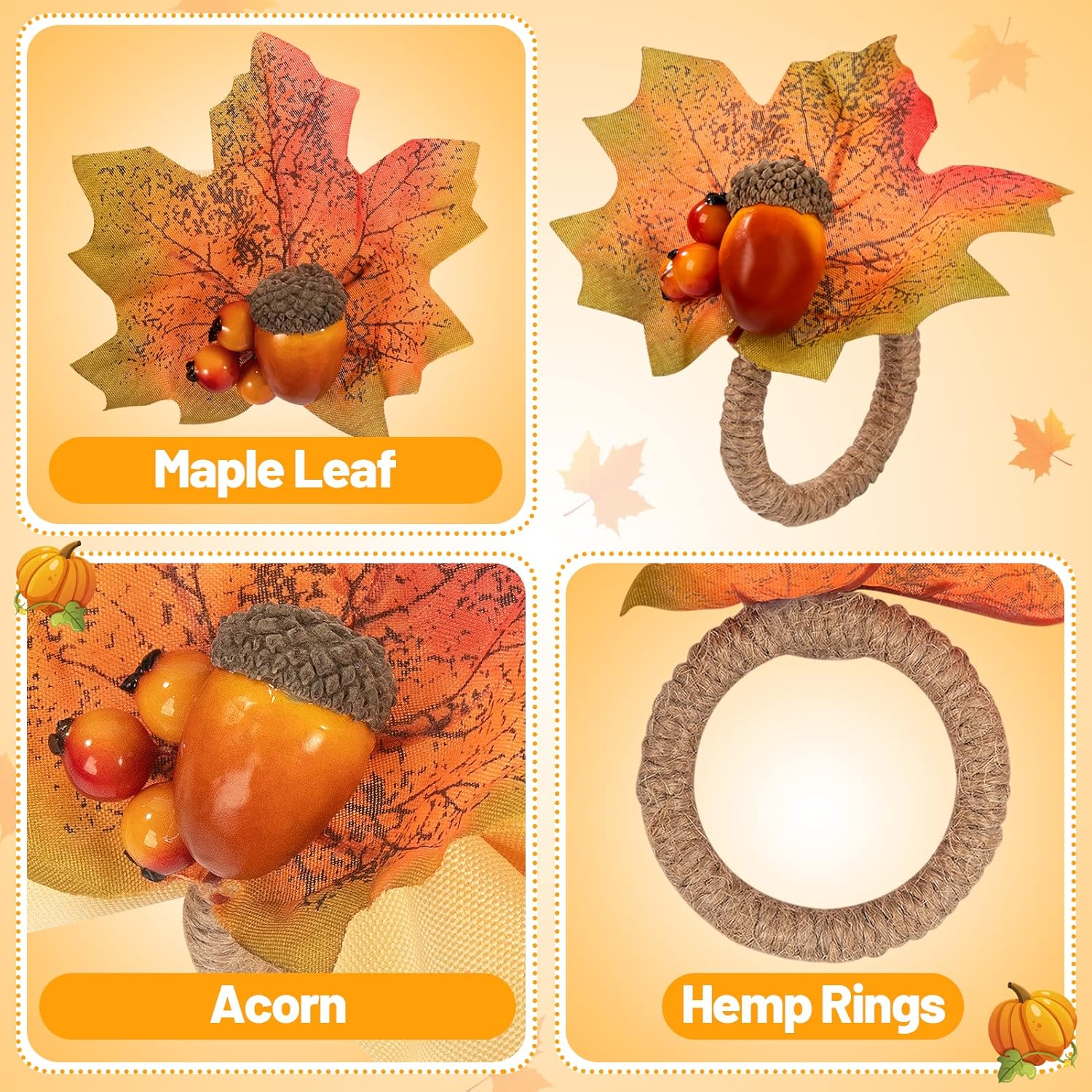 The autumn wind brings the joy of having a bumper harvest. We are grateful for the food presented by nature, as well as the time spent with relatives and friends. The significance of Thanksgiving lies not only in the sharing of food but also in the beauty of the gathering time. Are you looking to spice up your Thanksgiving decorations? Do you want to bring autumn to the table? Do you want a better dining atmosphere? Then you must not miss these fall maple napkin holder . Feature EXCLUSIVE STYLE The gradual maple leaves convey to people that the seasons are changing, and the pace of autumn is getting closer and closer. Acorns and berries that ripen in the same season as pumpkins are round and lovely. When the table is decorated with acorn maple leaf napkin rings, they can make people feel like dining in the woods. CREATE A WONDERFUL DINNER ATMOSPHERE If you only celebrate the harvest with Turkey on Thanksgiving, you will feel that there is something missing. These autumn and Thanksgiving napkin ring holders can be used to make up for your pity. They can make your meal more enjoyable. LONG SERVICE TIME Thanksgiving is not the only time for family and friends to get together. In the autumn of a few months, you can use these rings to decorate every autumn-themed dinner. Maple Leaf napkin rings can accompany people through several Thanksgiving and falls. Product Specifications Material: fabric,sisal, PE Combination: maple leaf, berry, Acorn Quantity: 12