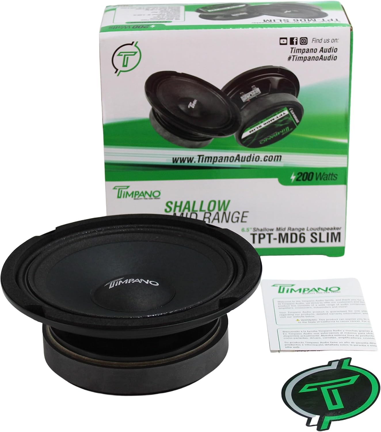 Timpano 6.5 inch 8 Ohm 200 Watts Shallow Mid-Range Speaker TPT-MD6-SLIMThis Listing Includes:(1) 6.5 inch 8 Ohm 200 Watts Shallow Mid-Range SpeakerTimpano’s TPT-MD6 SLIM 6.5″ midrange speaker is a great choice for adding some high output vocals to professional and car audio sound systems. Engineered to be efficient without sacrificing power or performance, this driver utilizes an extremely efficient ferrite motor and high temperature voice coil, bringing to you a suitable option to upgrade your system to a high level of performance and SPL output.Specifications:Frequency Range 95 - 6500 Hz94 dB sensitivityMax Wattage 200; RMS 100WWeight: 3.96 LbsMounting Cutout Diameter: 5.65"Mounting Depth: 2.22"